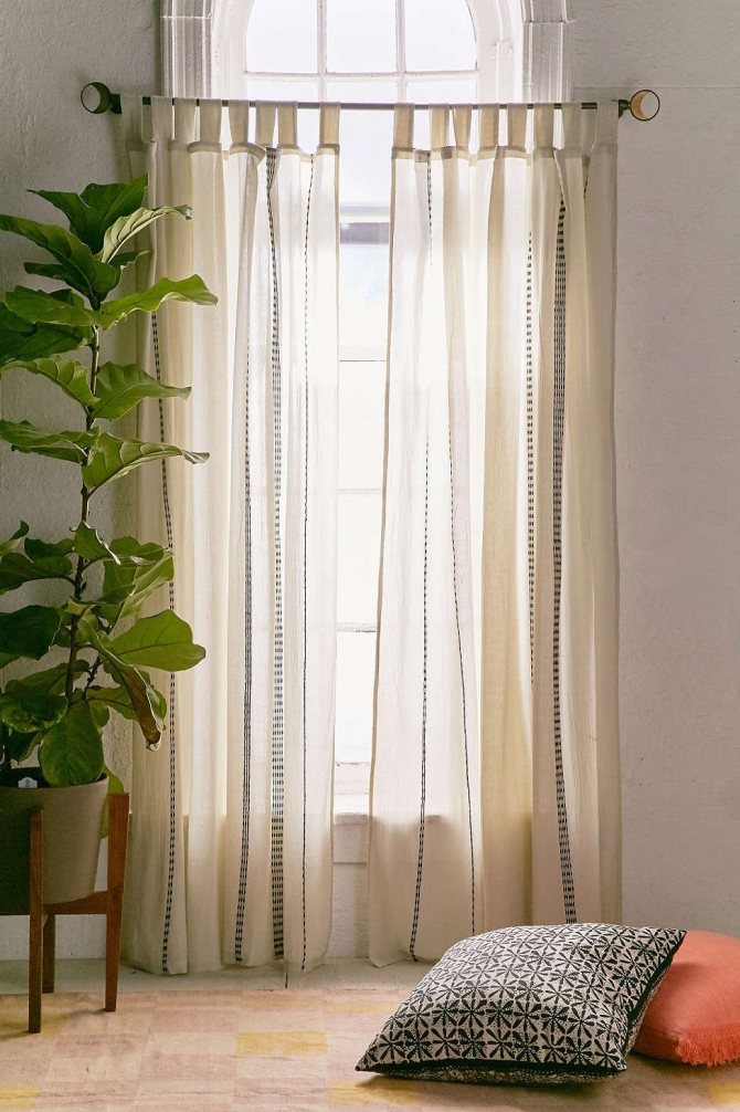 Нанесите на ваши окна быстрый мейк-ап, повесив на них короткие шторы с вышивкой. Вышивка здесь – не просто изюминка домашнего текстиля, она выступает также в качестве корректора пространства, ведь вертикальные полоски делают потолки выше, а интерьер более приподнятым. Добавьте висячий горшок с растением около окна, и вы будете иметь совершенный эклектичный вид.