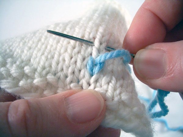 Технику этого шва еще называют петельным стежком. Выполняется такой рисунок с помощью вышивки по лицевой глади. Каждый стежок выполняется непосредственно по вязаным петелькам. Выполняться шов может в любом направлении, важно, чтобы элементы рисунка ложились аккуратно и в верхней части.