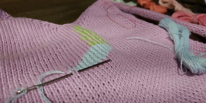 Красиво выглядеть должна не только лицевая сторона, но и изнаночная, поэтому необходимо вдевать нитку в иглу, чтобы она не распушалась, а также скрывать при окончании работы «хвостик». Это можно сделать, пряча его с лицевой стороны под основным рисунком или между петлями самого полотна.