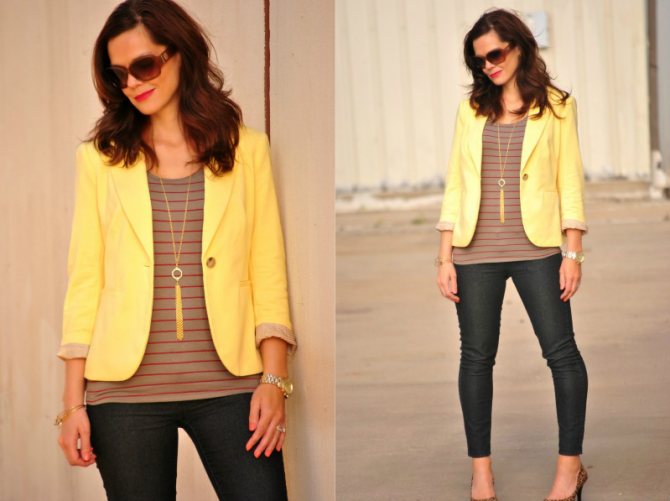 В сочетании с джинсами хорошо смотрится пиджак бледно-желтого или цвета лайма.
