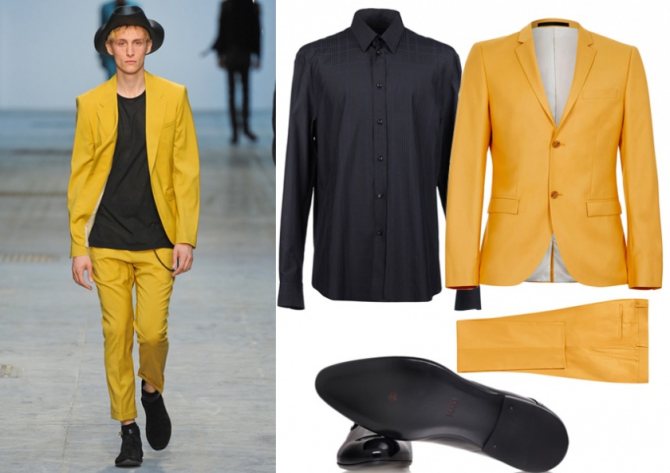 Мужские фото из модных журналов демонстрируют стильные образы для представителей сильного пола. Самые смелые могут сочетать желтый пиджак с зауженными джинсами и мокасинами апельсинового цвета или надеть комплект из ярко-желтых пиджака и брюк чинос с красной футболкой и черным ремнем.