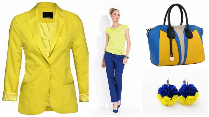 Сочетание синего с желтым выглядит очень празднично и воспринимается исключительно позитивно. Ведь это естественная природная комбинация (синее море – желтый песок или яркое желтое солнце на синем небе). Подбирая синие вещи к желтому жакету, старайтесь, чтобы элементы ансамбля смотрелись гармонично, а не вступали в «соперничество» друг с другом.